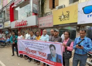 জনস্মুখে গাজীপুরের চান্দনা চৌরাস্তা এলাকায় অস্ত্রধারী দুর্বৃত্তদের এলোপাতাড়ি হামলায় দৈনিক প্রতিদিনের কাগজ পত্রিকার স্টাফ রিপোর্টার আসাদুজ্জামান তুহিন খুনসহ সারাদেশে সাংবাদিক নির্যাতনের প্রতিবাদে এবং অবিলম্বে মূল পরিকল্পনাকারীসহ হামলাকারীদের গ্রেফতার করে দৃষ্টান্তমূলক শাস্তির দাবিতে মৌলভীবাজার অনলাইন প্রেসক্লাব এর উদ্যাগে চৌমোহনা চত্বরে সর্বস্থরের সাংবাদিকসহ নানা পেশার মানুষের অংশ গ্রহনে প্রতিবাদ সভা অনুষ্ঠিত হয়েছে। ৯ আগস্ট (শনিবার) দুপুরে। মৌলভীবাজার অনলাইন প্রেসক্লাব এর সহ-সভাপতি জোসেপ আলী চৌধুরী এর সভাপতিত্বে ও সাধারণ সম্পাদক মশাহিদ আহমদ (দৈনিক আমাদের কন্ঠ) ও চিনু রঞ্জন তালুকদার (দৈনিক গণমুক্তি) এর যৌত্র সঞ্চালনায় আয়োজিত প্রতিবাদ সভায় বক্তব্য রাখেন- মৌলভীবাজার পৌর বিএনপি আহবায়ক কমিটির যুগ্ন আহবায়ক ও জেলা বিএনপির আহবায়ক কমিটির সদস্য মনোয়ার আহমেদ রহমান, মৌলভীবাজার এনসিপি যুগ্ন সমন্ময়কারী এহসান জাকারিয়া, দুরুদ আহমেদ (দীপ্ত নিউজ), সাংবাদিক এহসান বিন মুজাহির, মৌলভীবাজার অনলাইন প্রেসক্লাব এর সহ-সভাপতি অঞ্জন প্রসাদ রায় চৌধুরী, তাওহীদ ইসলাম দাবা একাডেমীর প্রতিষ্টাতা ও পরিচালক তাওহীদ ইসলাম, সাংবাদিক মঈনুল হক প্রমুখ।