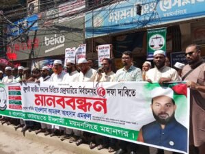 বাংলাদেশ জামায়াতে ইসলামী ময়মনসিংহ মহানগরের উদ্যোগে জুলাই জাতীয় সনদের ভিত্তিতে আগামী ফেব্রুয়ারিতে নির্বাচনসহ ৫ দফা দাবিতে মানববন্ধন অনুষ্ঠিত হয়েছে।