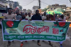 ১৬ ডিসেম্বর, মহান বিজয় দিবস উদযাপন উপলক্ষে বাংলাদেশ শ্রমিক কল্যাণ ফেডারেশন, গফরগাঁও উপজেলা শাখার উদ্যোগে বিজয় র্যালি অনুষ্ঠিত হয়েছে।
