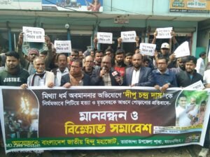 মিথ্যা ধর্ম অবমাননার অভিযোগে দীপু চন্দ্র দাসকে নির্মমভাবে পিটিয়ে হত্যা ও মৃতদেহ আগুনে পুড়ানোর প্রতিবাদে মানববন্ধন ও বিক্ষোভ সমাবেশ করেছে তারাকান্দায় কয়েকটি সংগঠনের ব্যানারে।