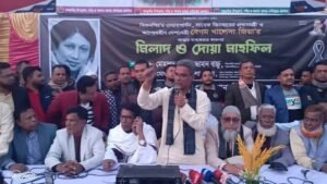দোয়া মাহফিল পূর্ব প্রধান অতিথির বক্তব্য রাখেন ময়মনসিংহ-১০ গফরগাঁও আসনের বিএনপির মনোনীত প্রার্থী জেলা দক্ষিণ বিএনপির সদস্য মোহাম্মদ আক্তারুজ্জামান বাচ্চু।
